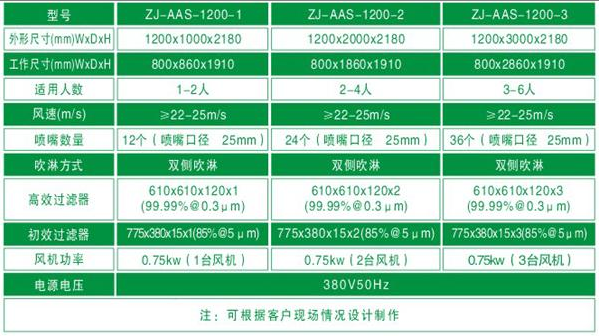 “梓凈”牌標準電加熱風淋室技術(shù)參數(shù):