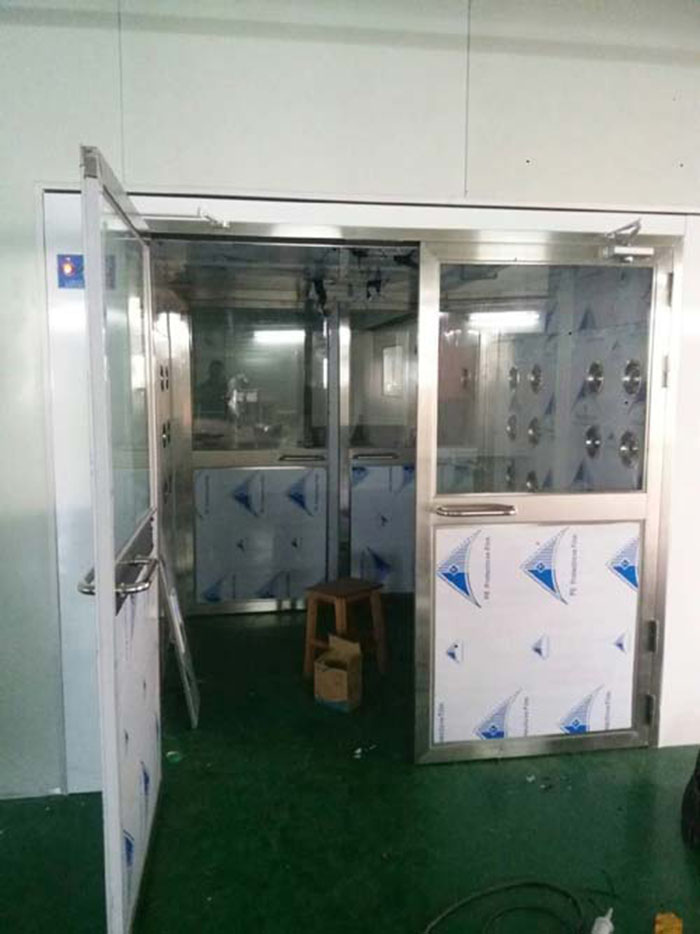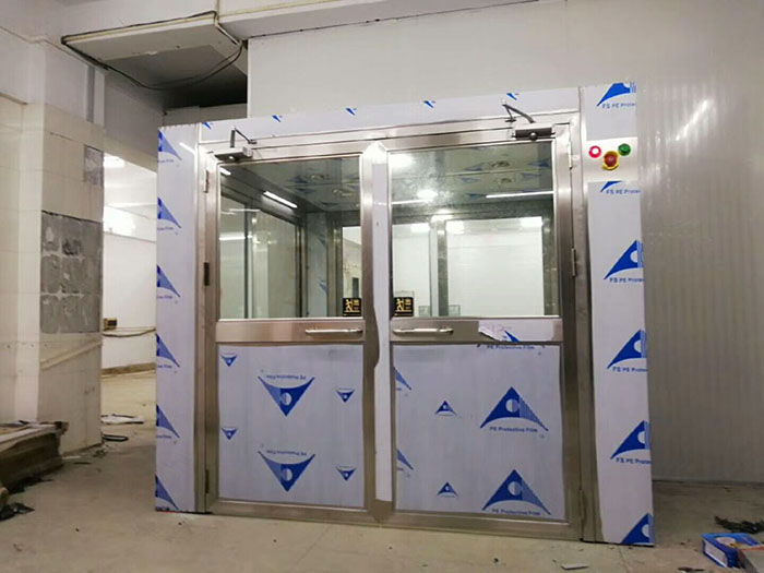 3、手動(dòng)雙開(kāi)門(mén)貨物風(fēng)淋室閉門(mén)器選擇90度定位,手動(dòng)雙開(kāi)門(mén)人淋風(fēng)淋室閉門(mén)器選擇不定位的。貨物風(fēng)淋室現(xiàn)場(chǎng)安裝圖貨物風(fēng)淋室制作及功能: