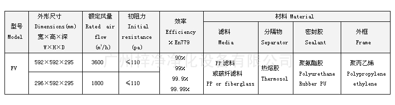 FV組合式亞高效過(guò)濾器型號(hào)、尺寸及其它參數(shù):