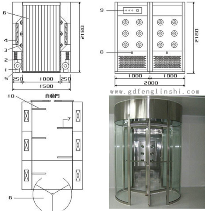 B、盡管潔凈室與非潔凈室本身也造成風(fēng)力和氣壓,有大量氣流和地面風(fēng),旋轉(zhuǎn)門風(fēng)淋室運轉(zhuǎn)起來仍然毫不費力、輕巧自如,因為向里推門的氣壓和向外推門的氣壓式相等的。旋轉(zhuǎn)門風(fēng)淋室結(jié)構(gòu)及方案圖三、旋轉(zhuǎn)門風(fēng)淋室部件結(jié)構(gòu)組成: