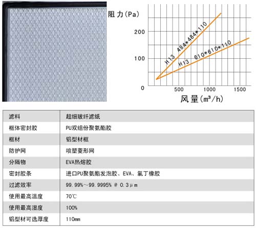 規(guī)格尺寸(W×H×D)(mm)484×484×150》風量530;過濾面積(m2)6.0≥ 容塵量(g)320≥ 初阻力(面風速0.5m/s時)=200Pa;終阻力400Pa;過濾效率0.5μm,F6-H12。