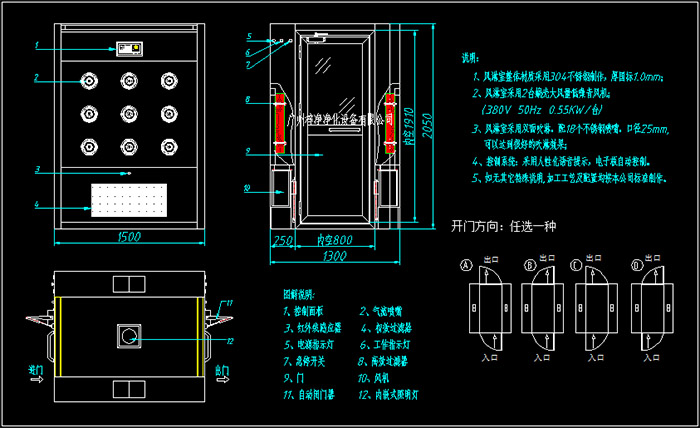 緊急疏散:在緊急疏散情況下,門應(yīng)能迅速打開,因此調(diào)出方向的設(shè)計(jì)更加安全。確保在緊急情況下人員可以迅速離開風(fēng)淋室。