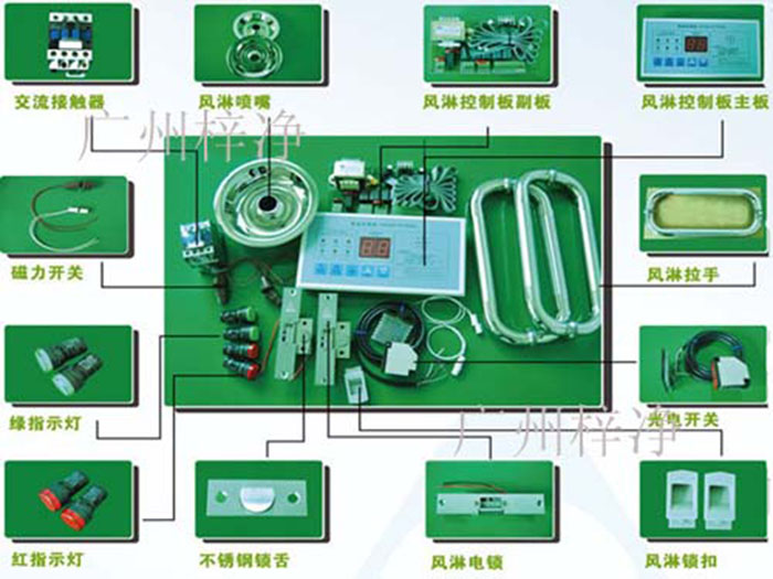 了解、風淋室陰極鎖,風淋室光電開關感應器,風淋室控制器,風淋室風機,風淋室高效過濾器等。